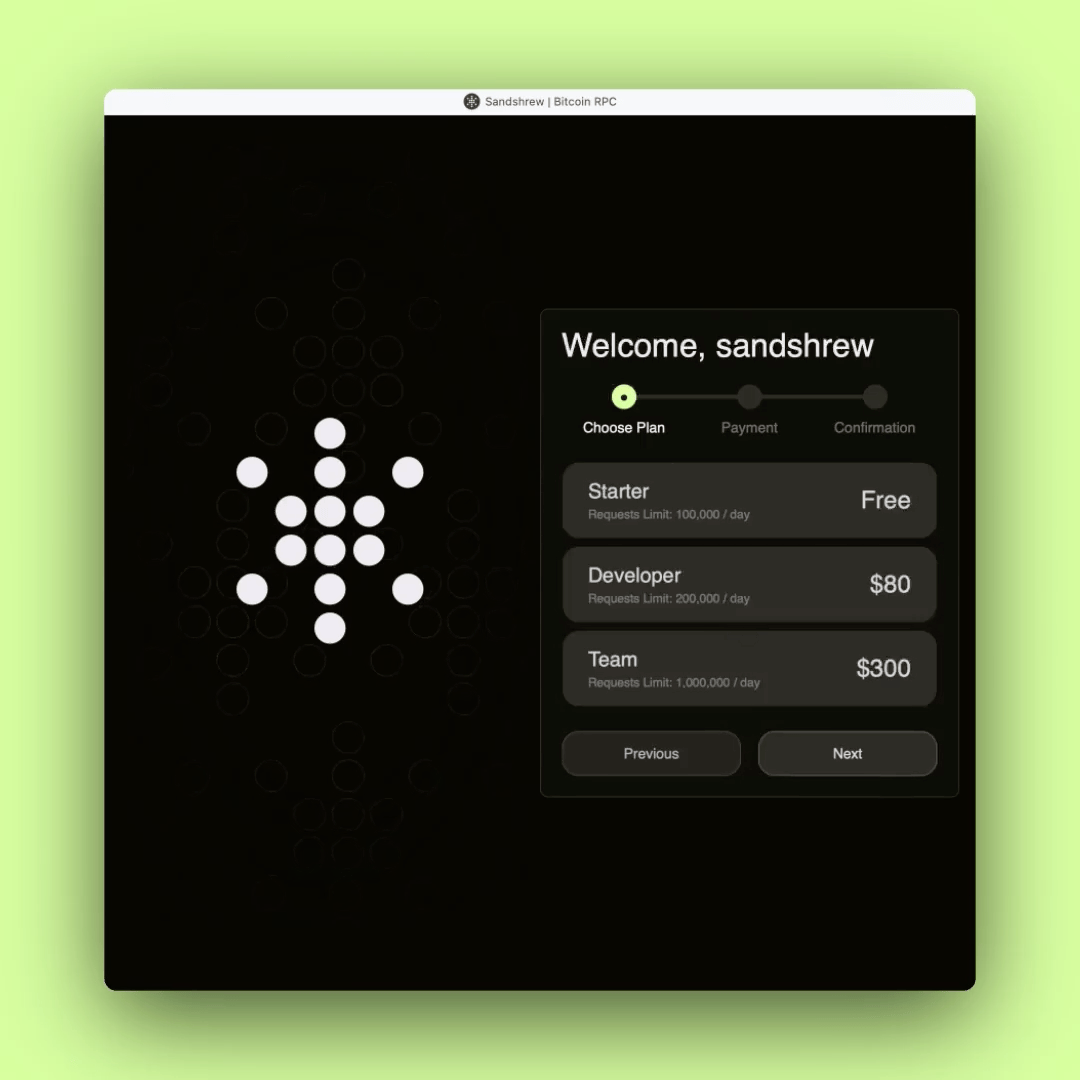 An API key is received after setting up your account and plan on [www.sandshrew.io ](https://www.sandshrew.io/).